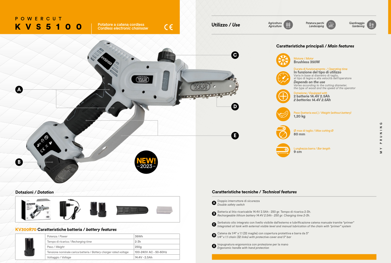 KVS5100 es la nueva motosierra eléctrica con doble interruptor de seguridad, cadena de 1/4″*1.1 con protector y barra de 5″, mango ergonómico, protección para manos.
