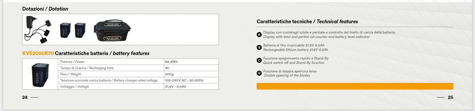 KVS7000P es la nueva motosierra práctica y ligera de VOLPI ORIGINALE. Esta herramienta está equipada con una cadena de 1/4″, protector y barra de 8″. Esta motosierra está disponible en dos versiones diferentes según la longitud de la espada: KVS7000P- longitud cerrada: 170 cm- longitud abierta: 250 cm; KVS7100P- largo cerrado: 250cm- largo abierto: 350cm El depósito de aceite está integrado en el cabezal de la herramienta y el nivel es visible desde el exterior, con engrase de cadena automático y regulable. El equipamiento de serie incluye una bolsa de la marca VOLPI ORIGINALE, que permite organizar adecuadamente los elementos incluidos, como 2 baterías inalámbricas y un cargador de tres vías.