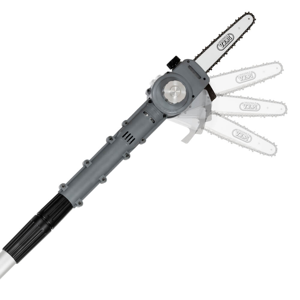Esta herramienta está diseñada para podar en altura, totalmente para la pértiga telescópica (longitud cerrada: 170 cm – longitud totalmente extendida: 250 cm). Su cabezal se puede ajustar a diferentes posiciones de ángulo y el tanque de aceite está integrado con lubricación de cadena automática y ajustable.