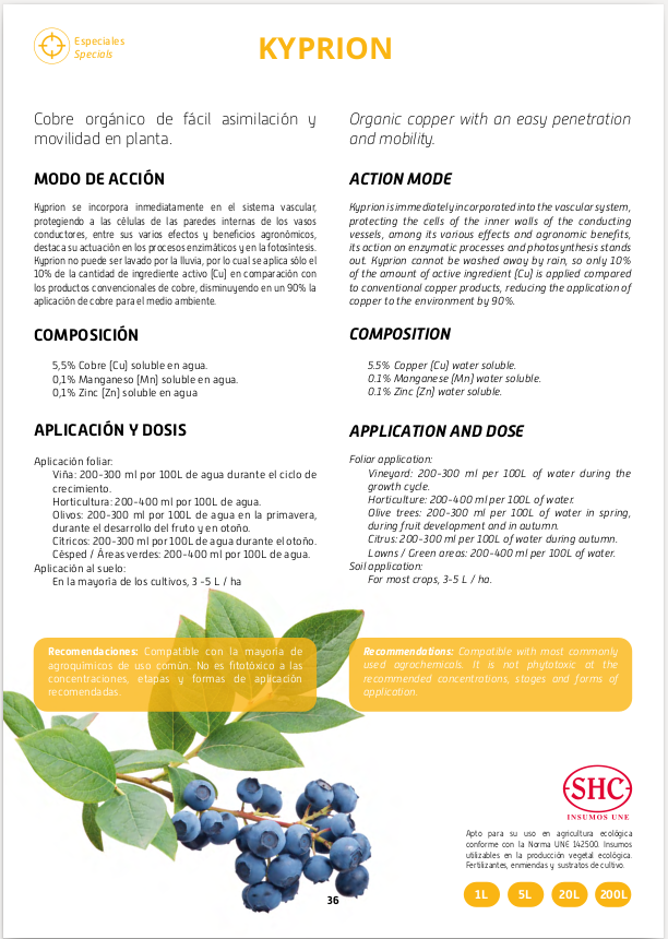 Efecto: KYPRION contiene cobre en forma de complejo orgánico que la planta absorbe fácilmente. El cobre tiene numerosos efectos fisiológicos beneficiosos para la planta: entre otros, participa en los procesos enzimáticos y la fotosíntesis, y, al absorberse, refuerza la resistencia fisiológica de la planta desde el interior.