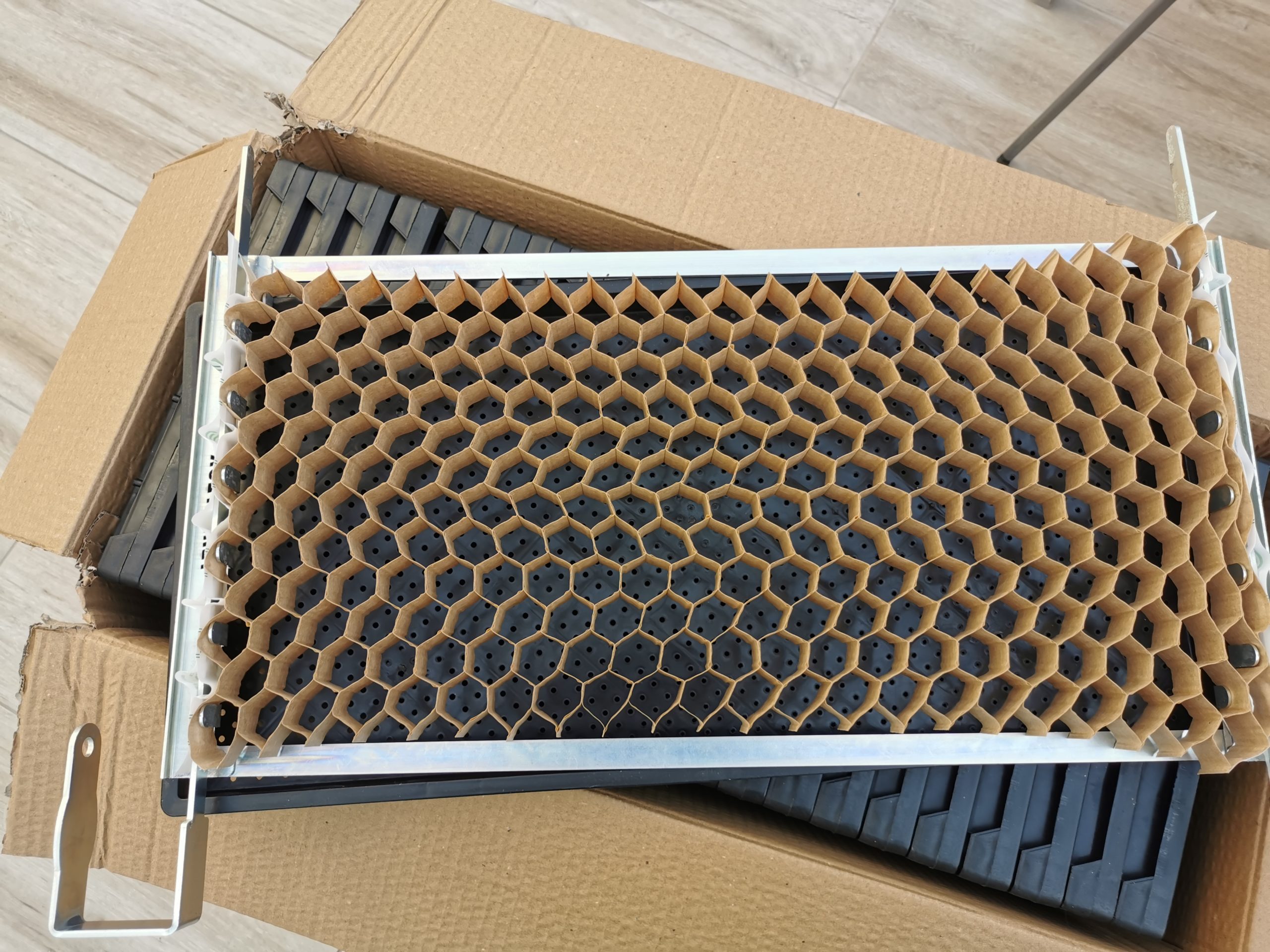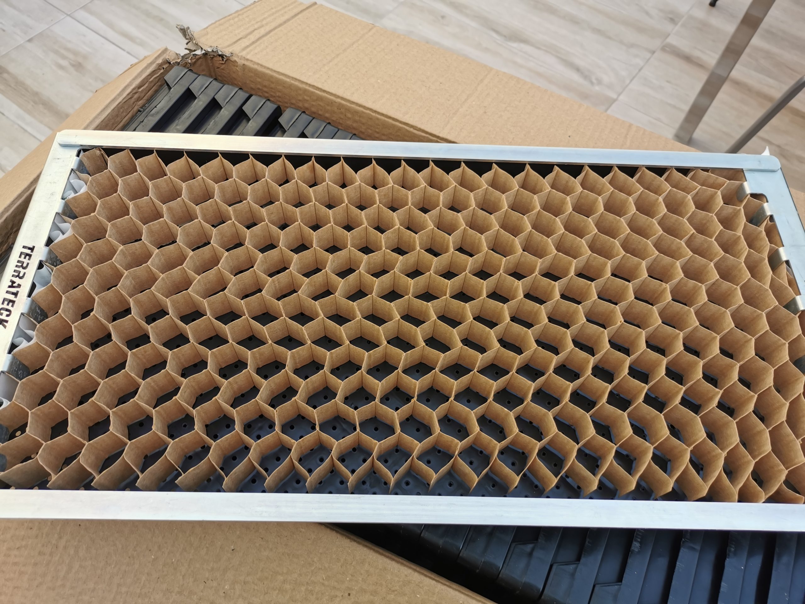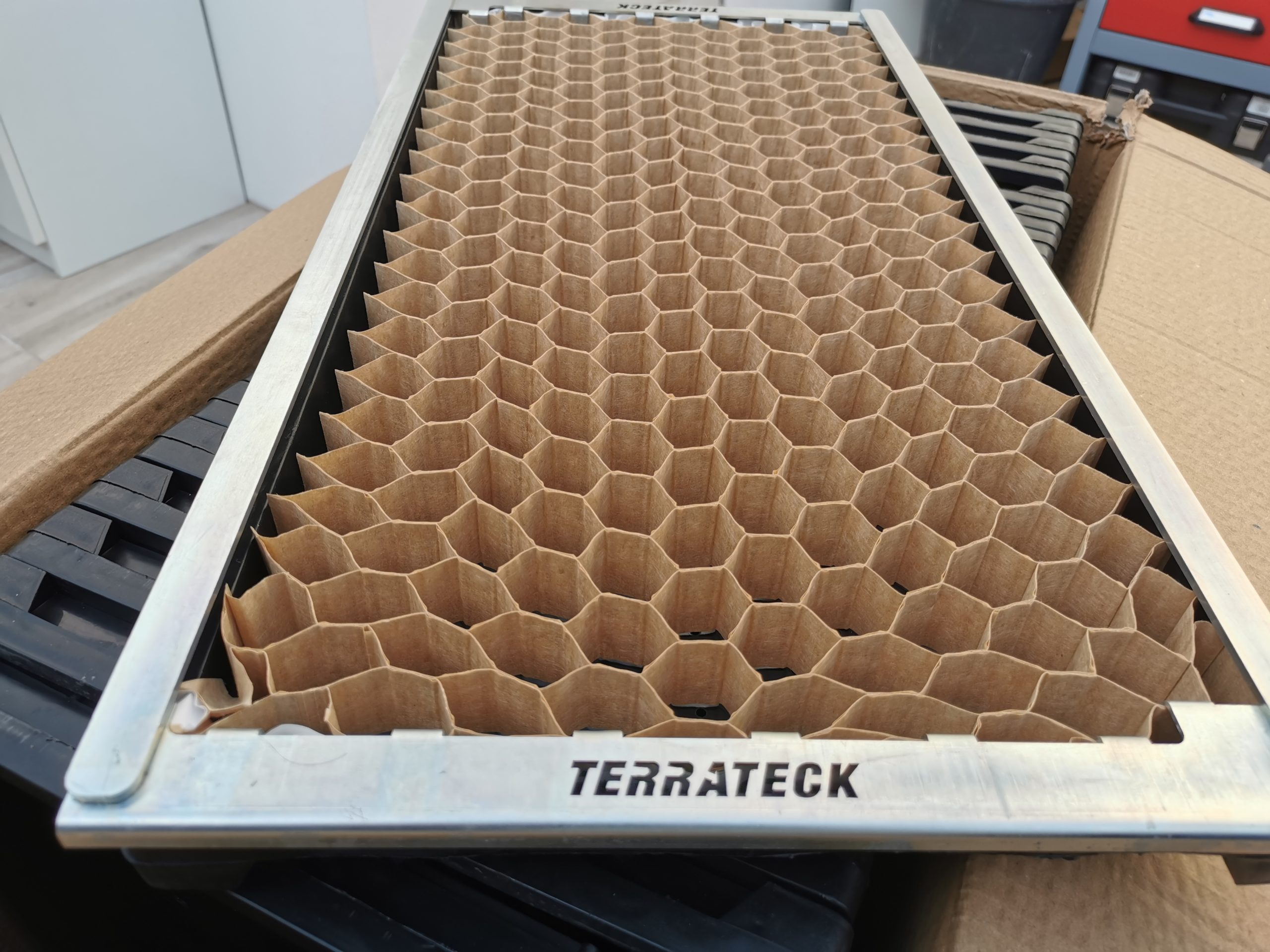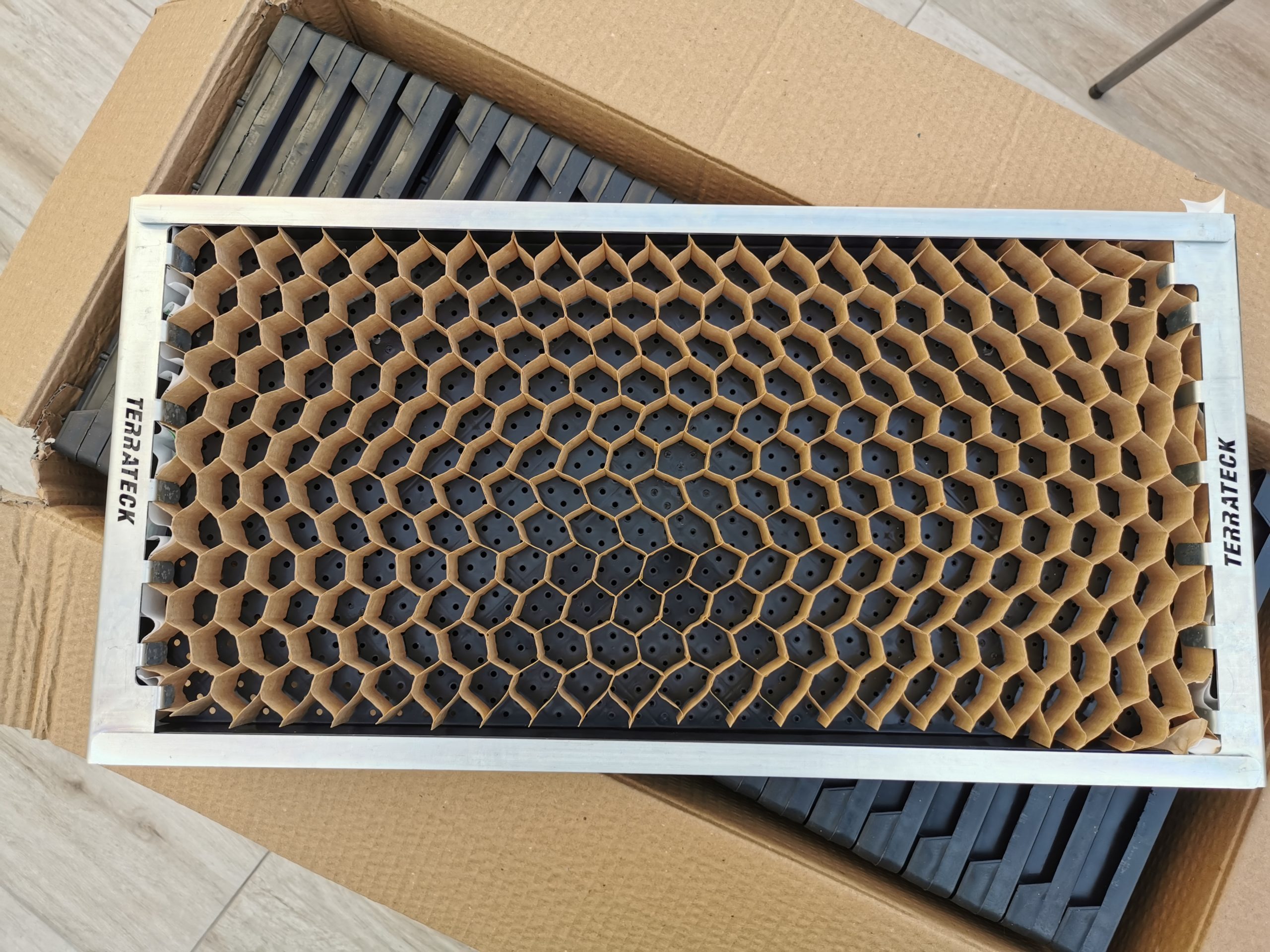 El semillero encaja en la bandeja de plántulas de Terrateck, pero también se puede insertar en otras bandejas de tamaño similar (60x30x3cm HxWxD). El semillero se ensarta como un acordeón, que, cuando se plantan las plántulas, al abrir el semillero, la sembradora manual Transplanter las desenrolla como una sudadera tejida y las planta en hilera en el suelo. El semillero proporciona una distancia de 5 cm entre las plantas, lo que lo hace ideal para plantar verduras de hoja verde y rábanos de un mes. Al trasplantar, el sistema de raíces de las plántulas apenas se mueve, por lo que no se rompen ni dañan, lo que permite un enraizamiento más rápido y un menor estancamiento en el desarrollo.